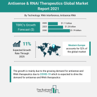 The global antisense & RNAi therapeutics market is expected to grow from $1.11 billion in 2020 to $1.2 billion in 2021 at a compound annual growth rate (CAGR) of 8.1%. The growth is mainly due to the companies resuming their operations and adapting to the new normal while recovering from the COVID-19 impact, which had earlier led to restrictive containment measures involving social distancing, remote working, and the closure of commercial activities that resulted in operational challenges. The market is expected to reach $1.79 billion in 2025 at a CAGR of 11%.