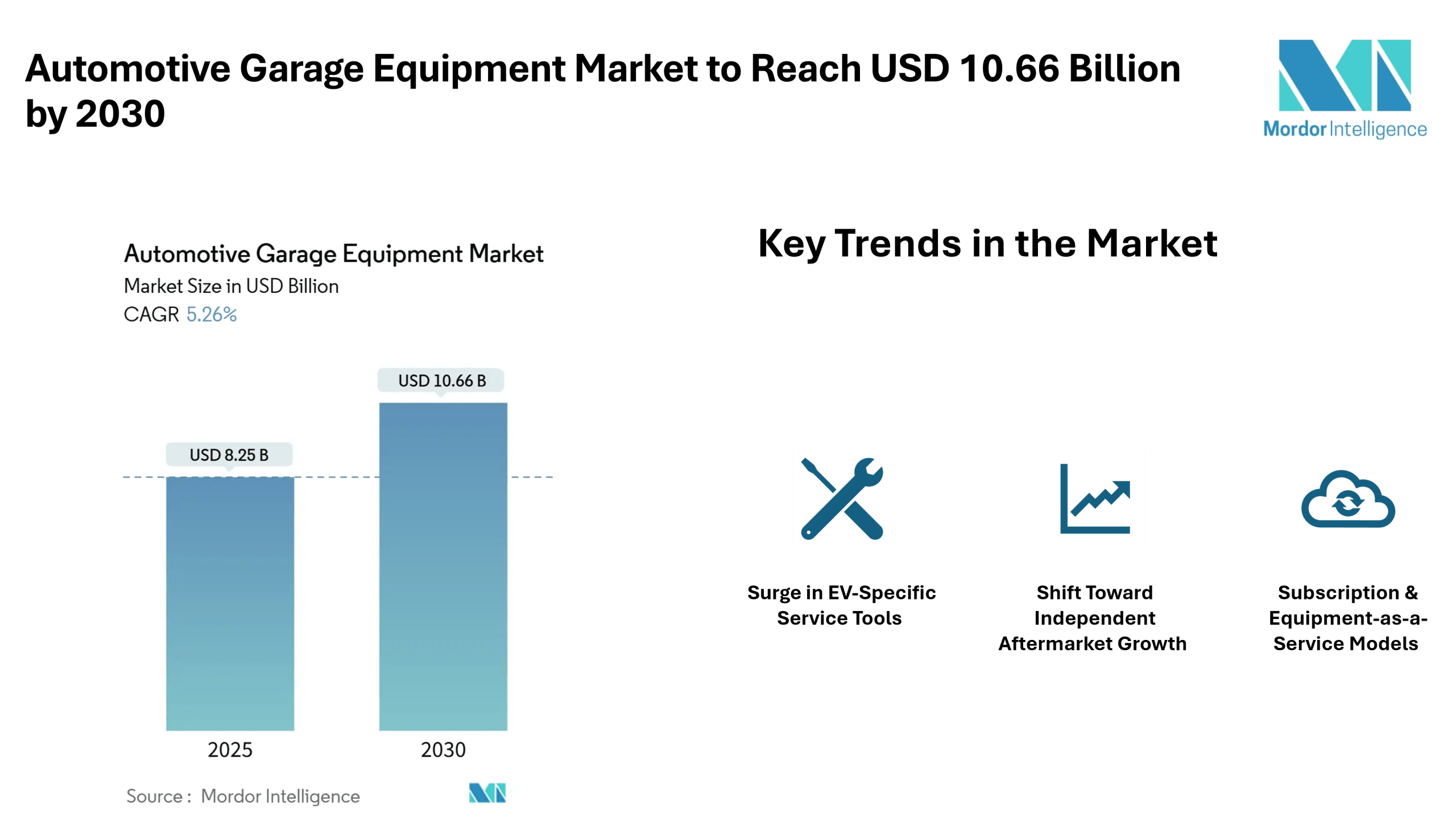 The Automotive Garage Equipment Market size stood around USD 8.25 billion in 2025 and is forecast to rise to USD 10.66 billion by 2030, reflecting a compound annual growth rate of approximately 5.26%. Growth is being driven by expanding vehicle fleets, more rigorous emissions standards, and the growing complexity of service requirements especially as electric vehicles (EVs) gain share.
