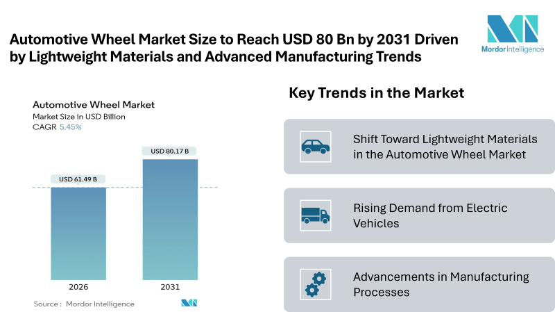 According to Mordor Intelligence, the automotive wheel market size is witnessing steady expansion, with the market size valued at USD 61.49 billion in 2026 and projected to reach USD 80.17 billion by 2031, registering a CAGR of 5.45%. This automotive wheel market growth reflects consistent demand from both passenger and commercial vehicle segments, along with increasing focus on performance, safety, and efficiency.